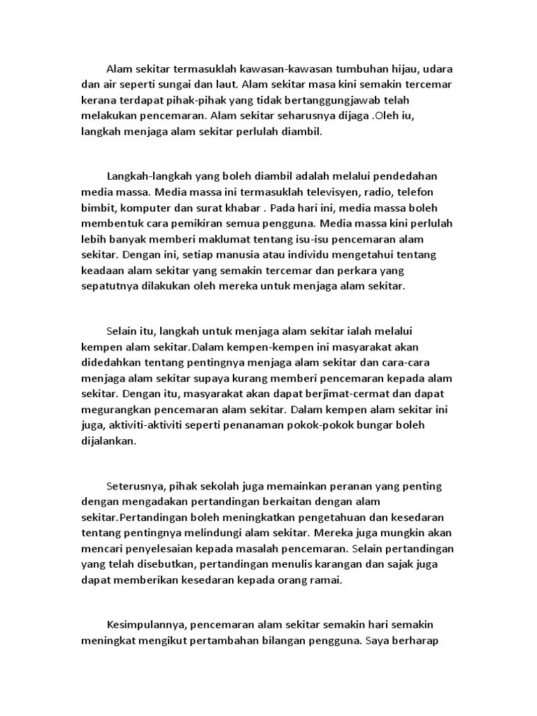 Bagaimanakah kita boleh membantu karangan alam sekitar? Ulasan cara menjaga alam sekitar pdf. Tajuk soalan karangan yang bertemakan alam sekitar lazim digunakan dalam latihan. Alam sekitar adalah sesuatu yang penting dalam kehidupan manusia, tidak mengira bangsa, agama dan negara. Ibu bapa perlu memberitahu anak kepen琀椀ngan menjaga alam. Di bawah dikongsikan contoh karangan pentingnya penjagaan alam sekitar kepada manusia.
